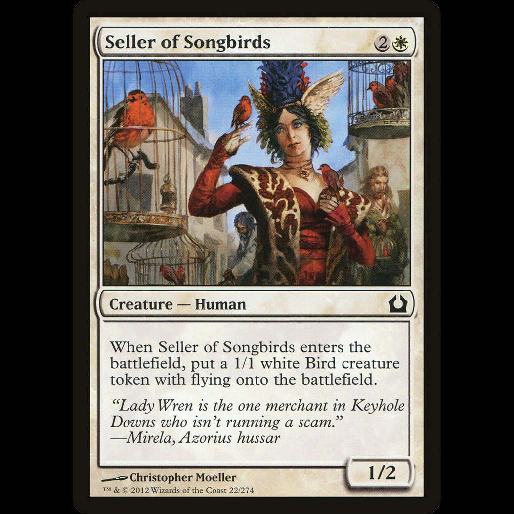 When Seller of Songbirds enters the battlefield, create a 1/1 white Bird creature token with flying.