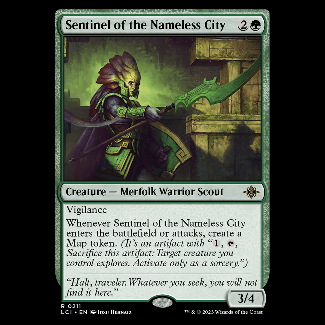 Whenever Sentinel of the Nameless City enters the battlefield or attacks, create a Map token. (It's an artifact with ", , Sacrifice this artifact: Target creature you control explores. Activate only as a sorcery.")