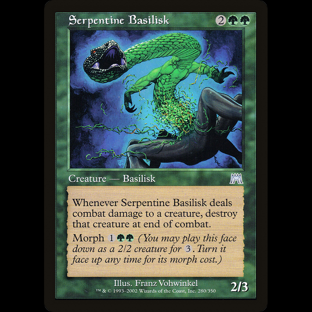 Whenever Serpentine Basilisk deals combat damage to a creature, destroy that creature at end of combat.