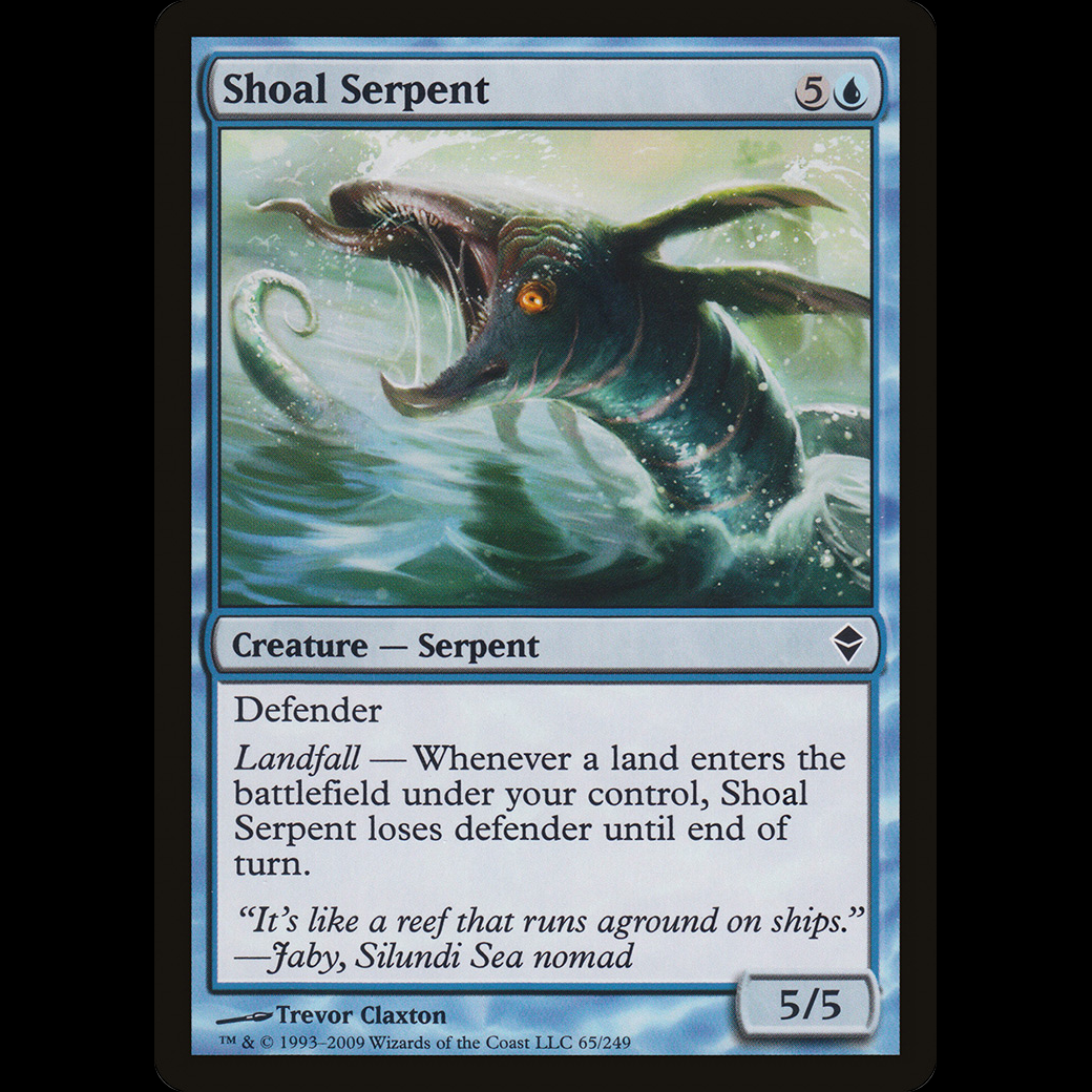 Landfall — Whenever a land enters the battlefield under your control, Shoal Serpent loses defender until end of turn.