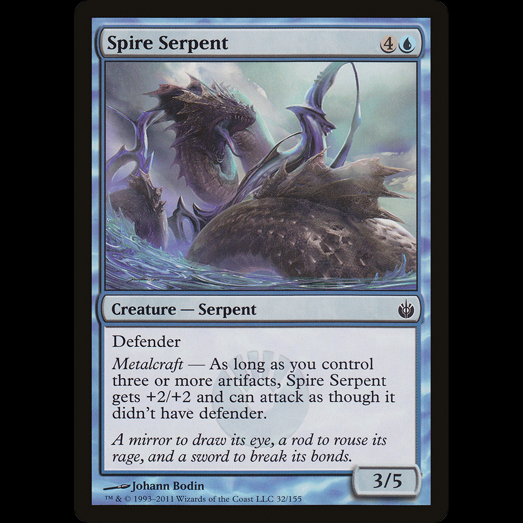 Metalcraft — As long as you control three or more artifacts, Spire Serpent gets +2/+2 and can attack as though it didn't have defender.