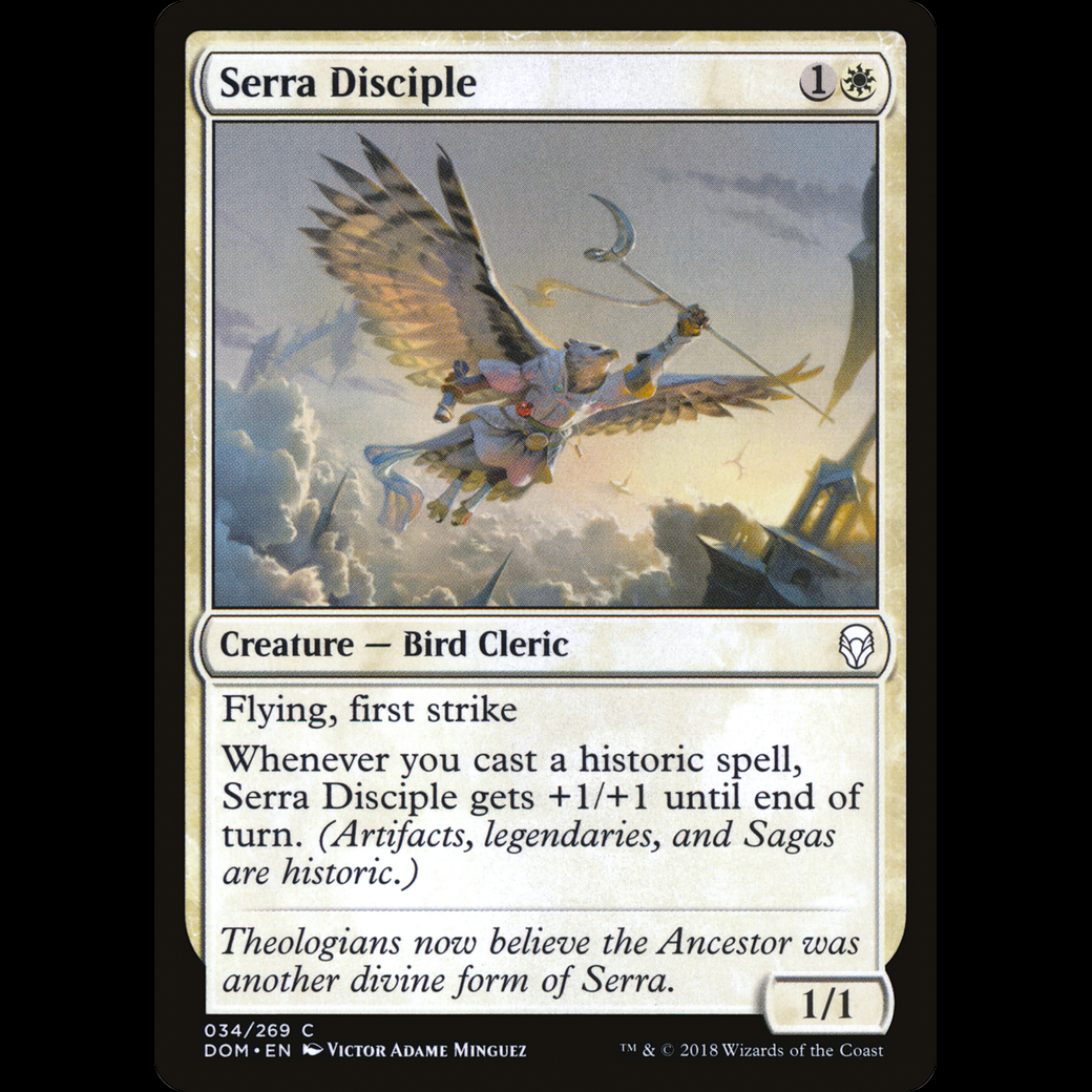 Whenever you cast a historic spell, Serra Disciple gets +1/+1 until end of turn. (Artifacts, legendaries, and Sagas are historic.)
