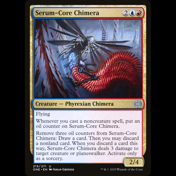 Remove three oil counters from Serum-Core Chimera: Draw a card. Then you may discard a nonland card. When you discard a card this way, Serum-Core Chimera deals 3 damage to target creature or planeswalker. Activate only as a sorcery.