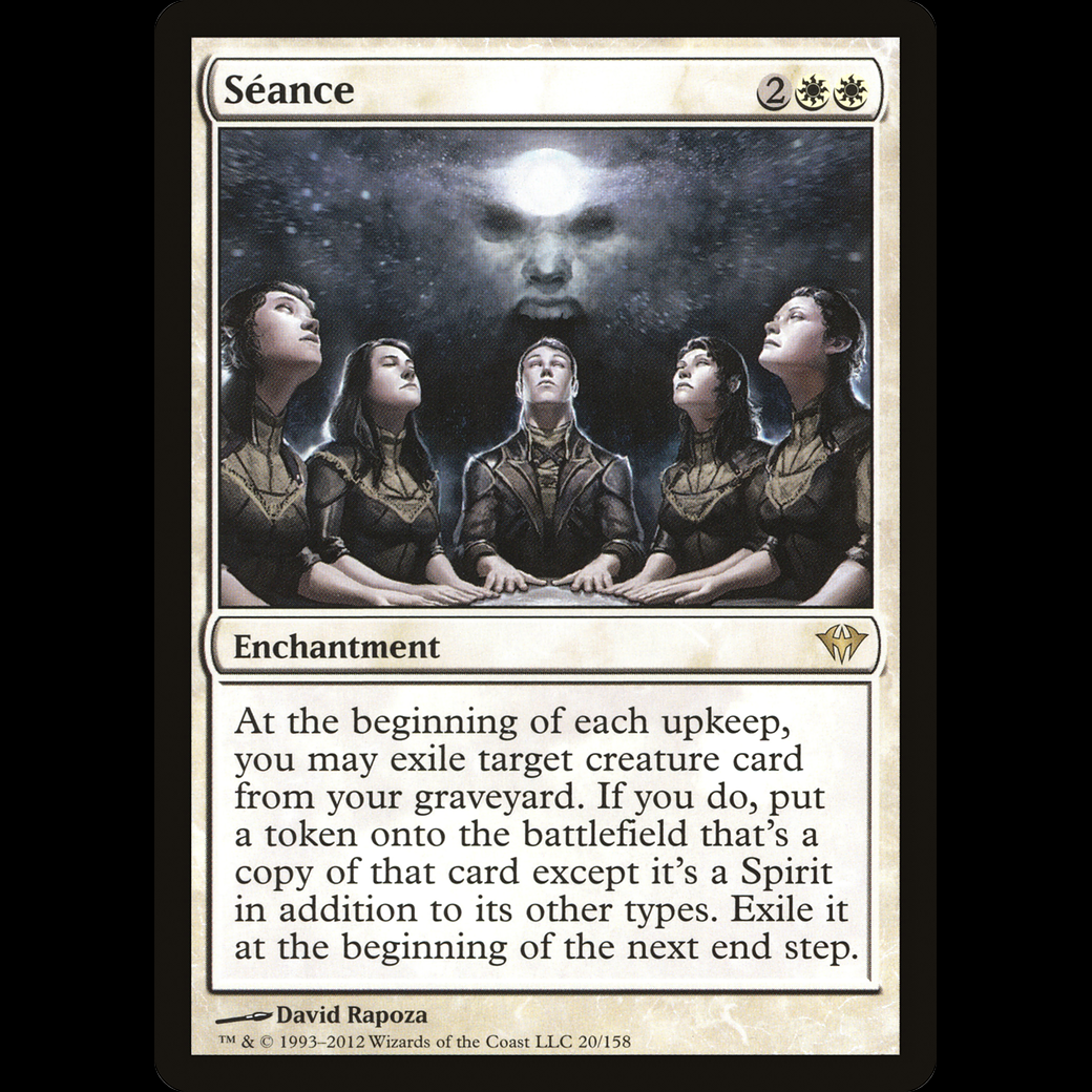 MTG Sesión de espiritismo (Séance) Dark Ascension At the beginning of each upkeep, you may exile target creature card from your graveyard. If you do, create a token that's a copy of that card, except it's a Spirit in addition to its other types. Exile it at the beginning of the next end step.