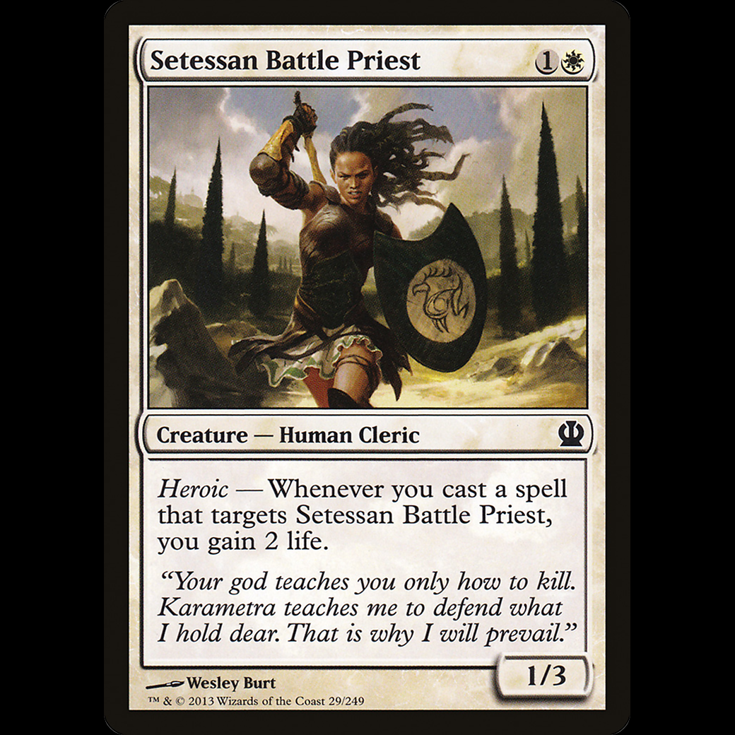 Heroic — Whenever you cast a spell that targets Setessan Battle Priest, you gain 2 life.