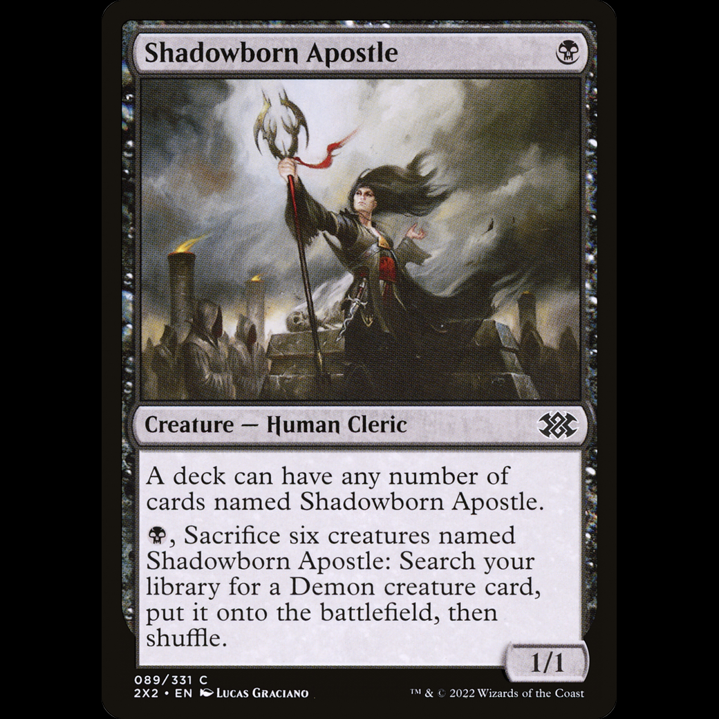 , Sacrifice six creatures named Shadowborn Apostle: Search your library for a Demon creature card, put it onto the battlefield, then shuffle.