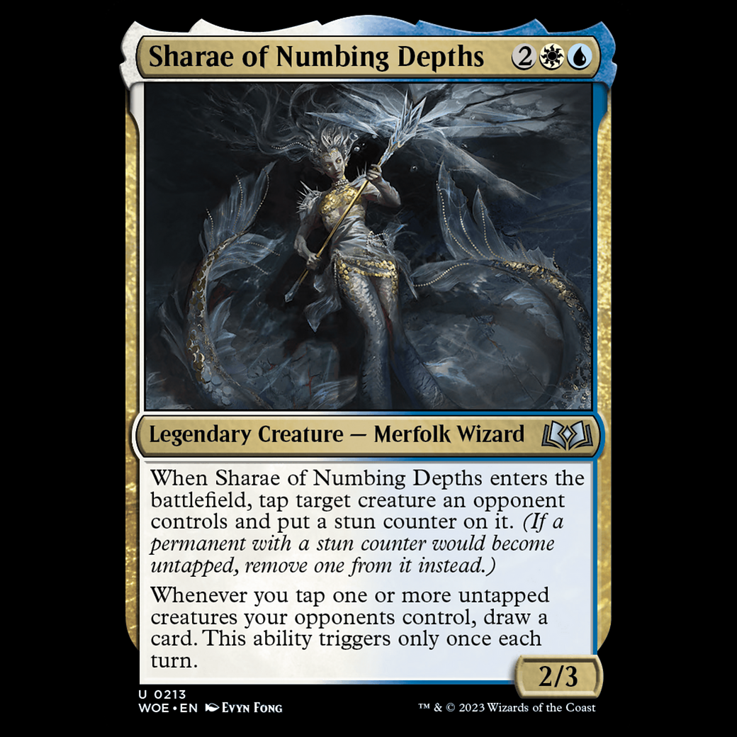 When Sharae of Numbing Depths enters the battlefield, tap target creature an opponent controls and put a stun counter on it. (If a permanent with a stun counter would become untapped, remove one from it instead.)