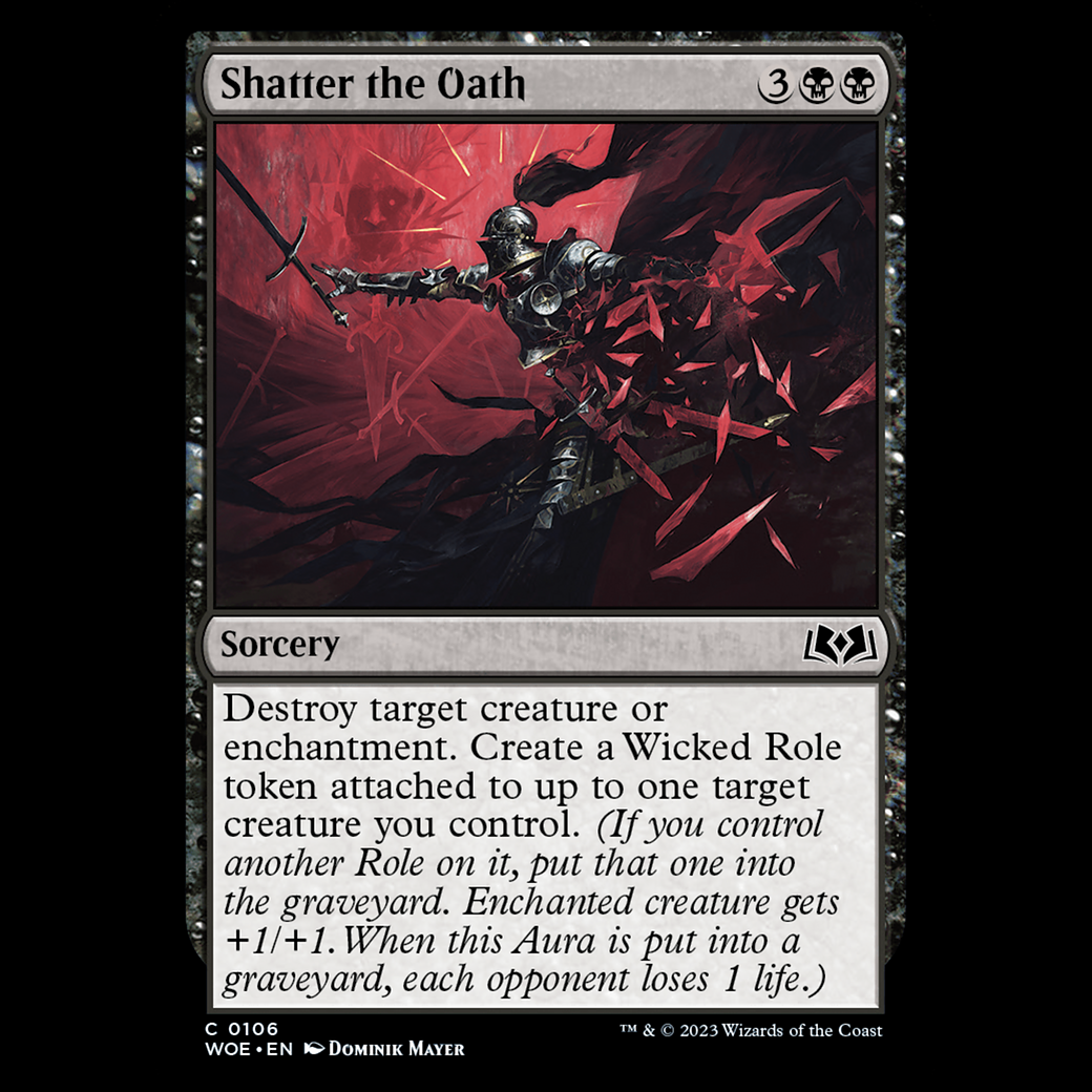 Destroy target creature or enchantment. Create a Wicked Role token attached to up to one target creature you control. (If you control another Role on it, put that one into the graveyard. Enchanted creature gets +1/+1. When this Aura is put into a graveyard, each opponent loses 1 life.)