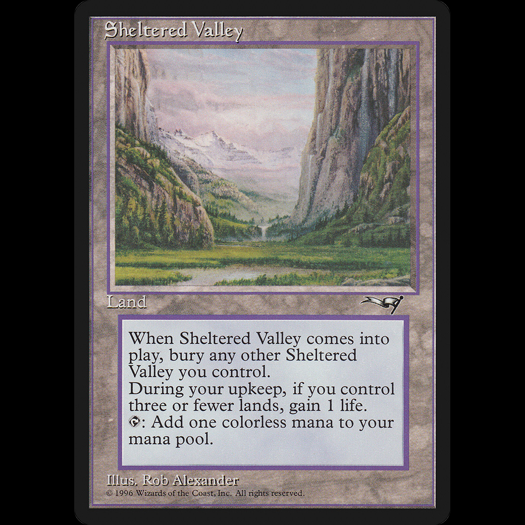 If Sheltered Valley would enter the battlefield, instead sacrifice each other permanent named Sheltered Valley you control, then put Sheltered Valley onto the battlefield.