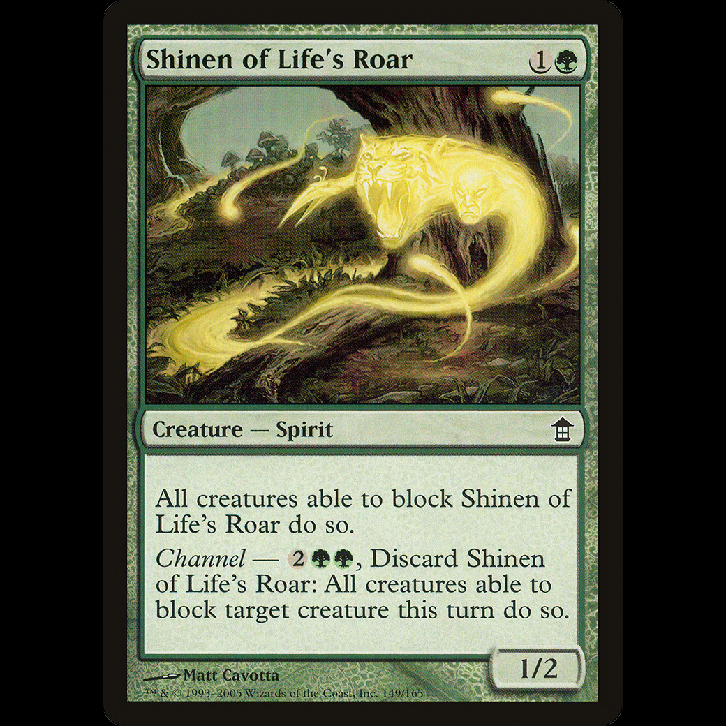 Channel — , Discard Shinen of Life's Roar: All creatures able to block target creature this turn do so.