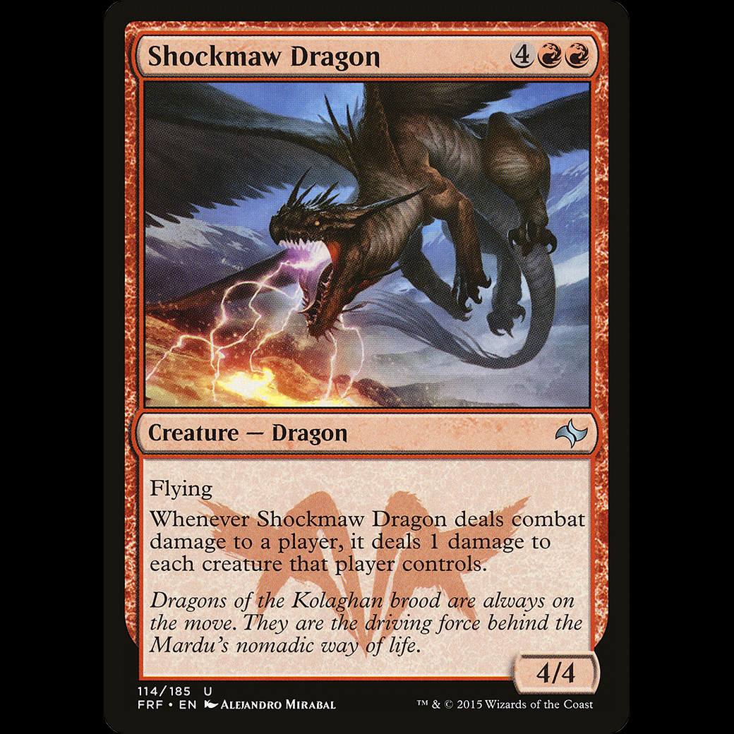 Whenever Shockmaw Dragon deals combat damage to a player, it deals 1 damage to each creature that player controls.