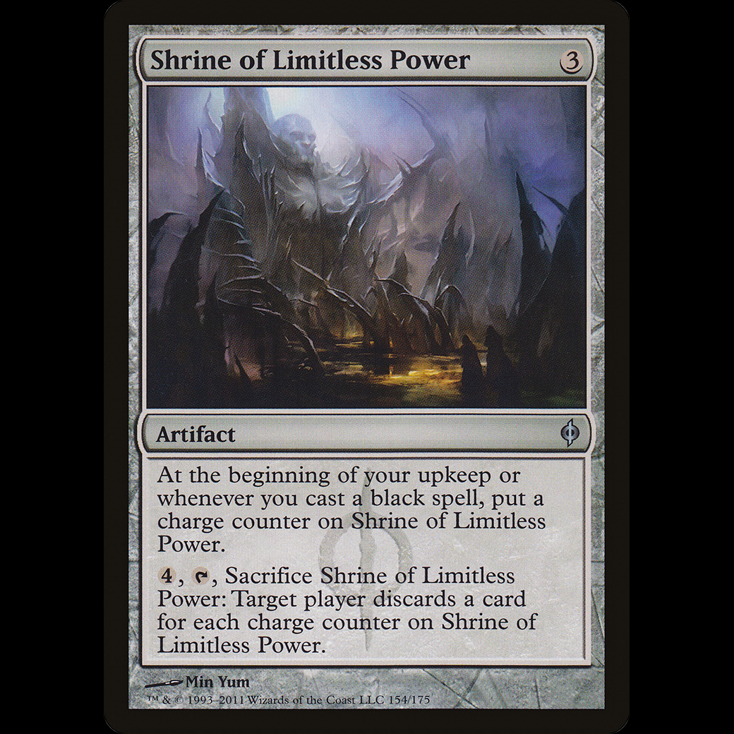 , , Sacrifice Shrine of Limitless Power: Target player discards a card for each charge counter on Shrine of Limitless Power.