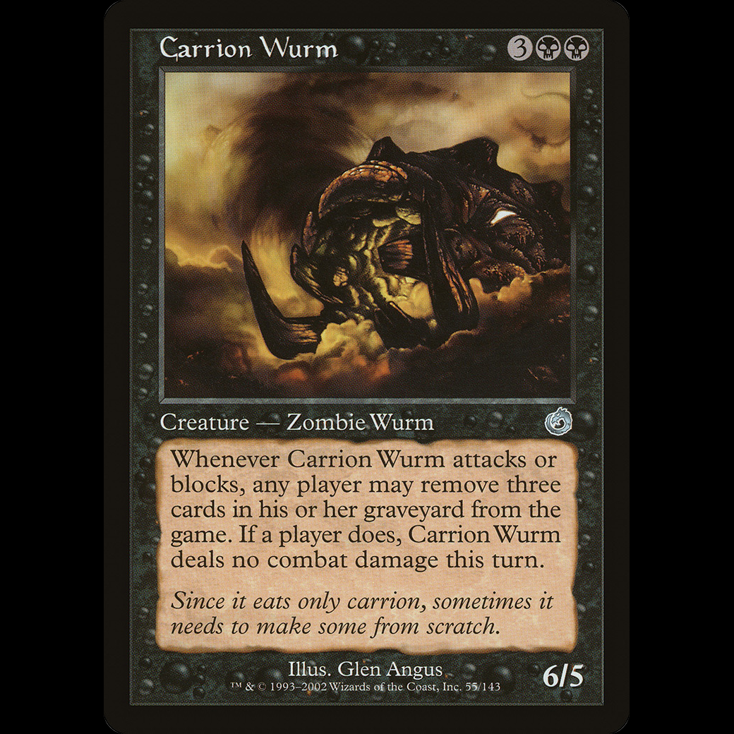 Whenever Carrion Wurm attacks or blocks, any player may exile three cards from their graveyard. If a player does, Carrion Wurm assigns no combat damage this turn.