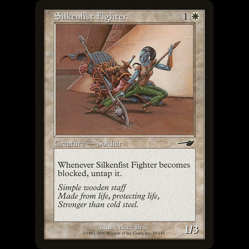 MTG Silkenfist Fighter NemesisWhenever Silkenfist Fighter becomes blocked, untap it.
