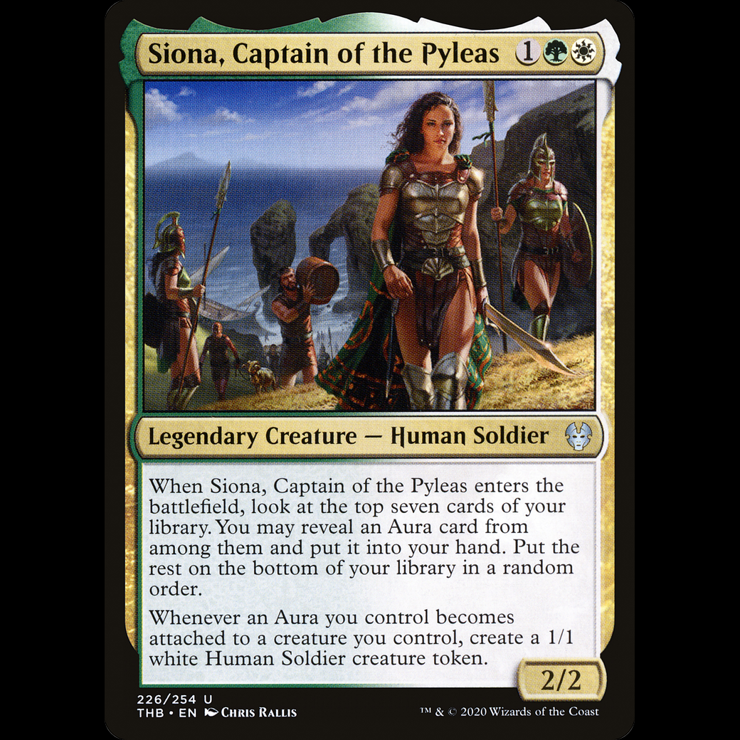 When Siona enters, look at the top seven cards of your library. You may reveal an Aura card from among them and put it into your hand. Put the rest on the bottom of your library in a random order.