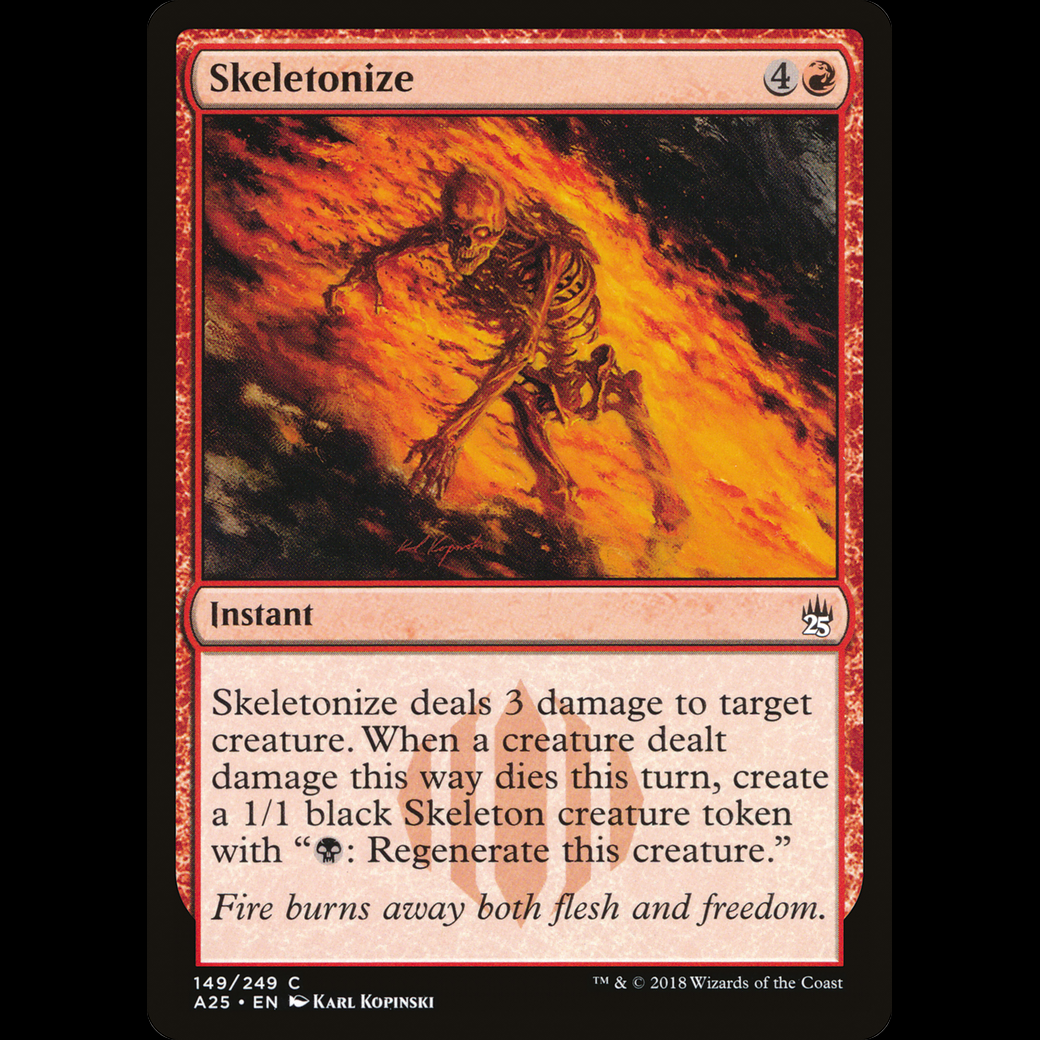 Skeletonize deals 3 damage to target creature. When a creature dealt damage this way dies this turn, create a 1/1 black Skeleton creature token with ": Regenerate this creature."