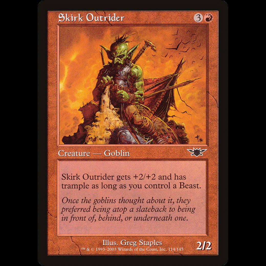 As long as you control a Beast, Skirk Outrider gets +2/+2 and has trample.