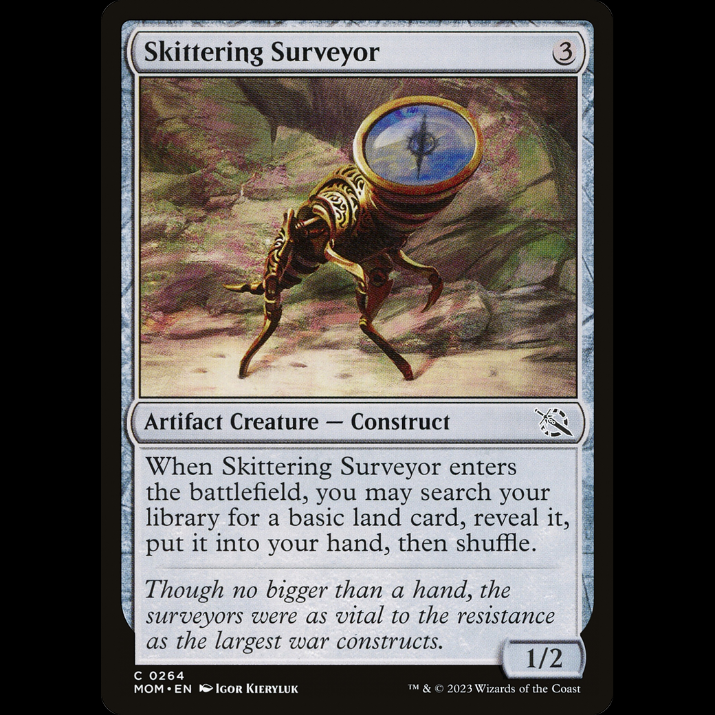 When Skittering Surveyor enters the battlefield, you may search your library for a basic land card, reveal it, put it into your hand, then shuffle.