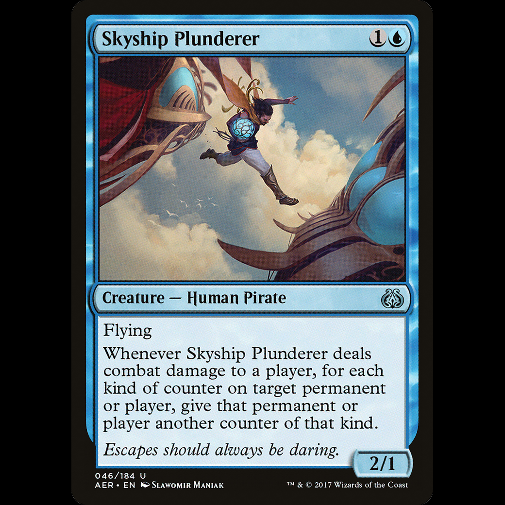 Whenever Skyship Plunderer deals combat damage to a player, for each kind of counter on target permanent or player, give that permanent or player another counter of that kind.