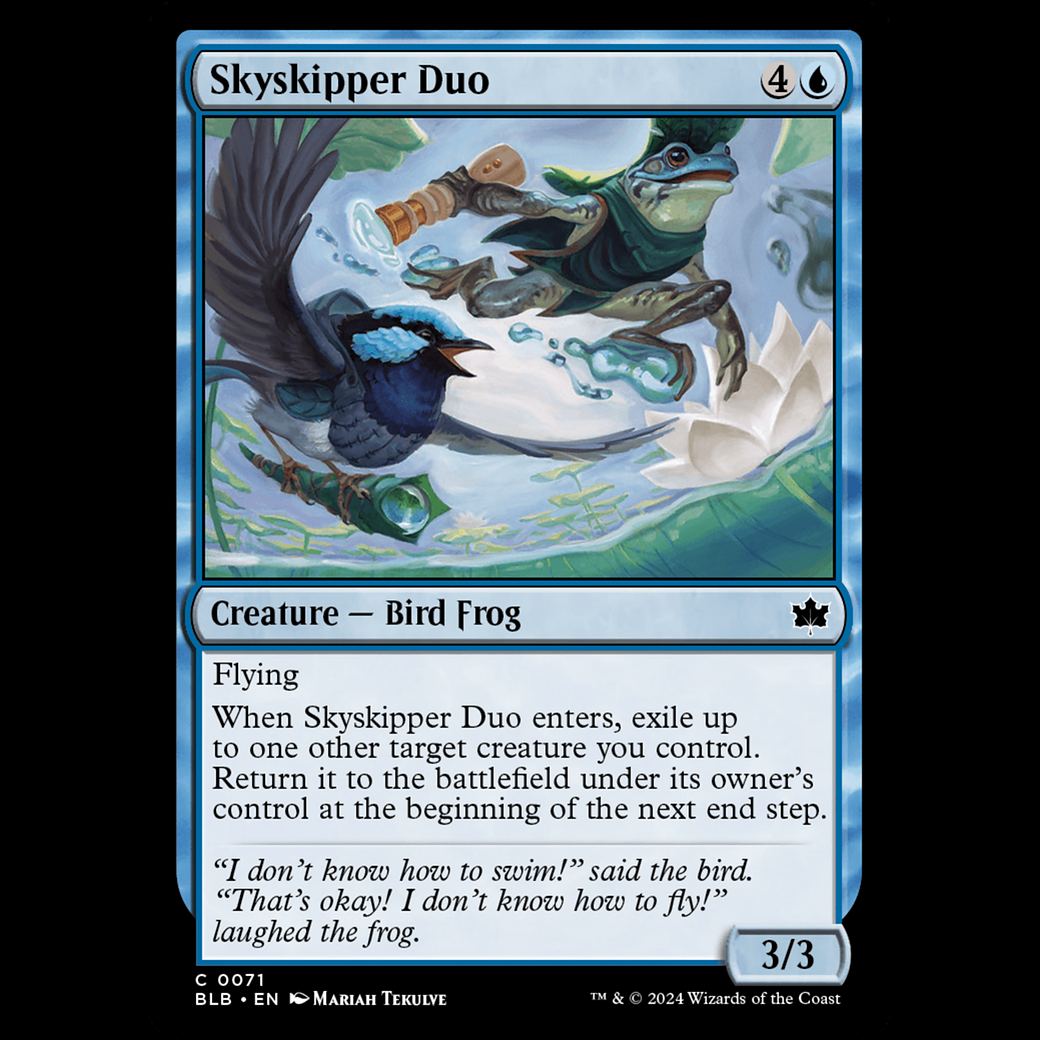 MTG Skyskipper Duo Bloomburrow blb#71 Flying When Skyskipper Duo enters, exile up to one other target creature you control. Return it to the battlefield under its owner's control at the beginning of the next end step.