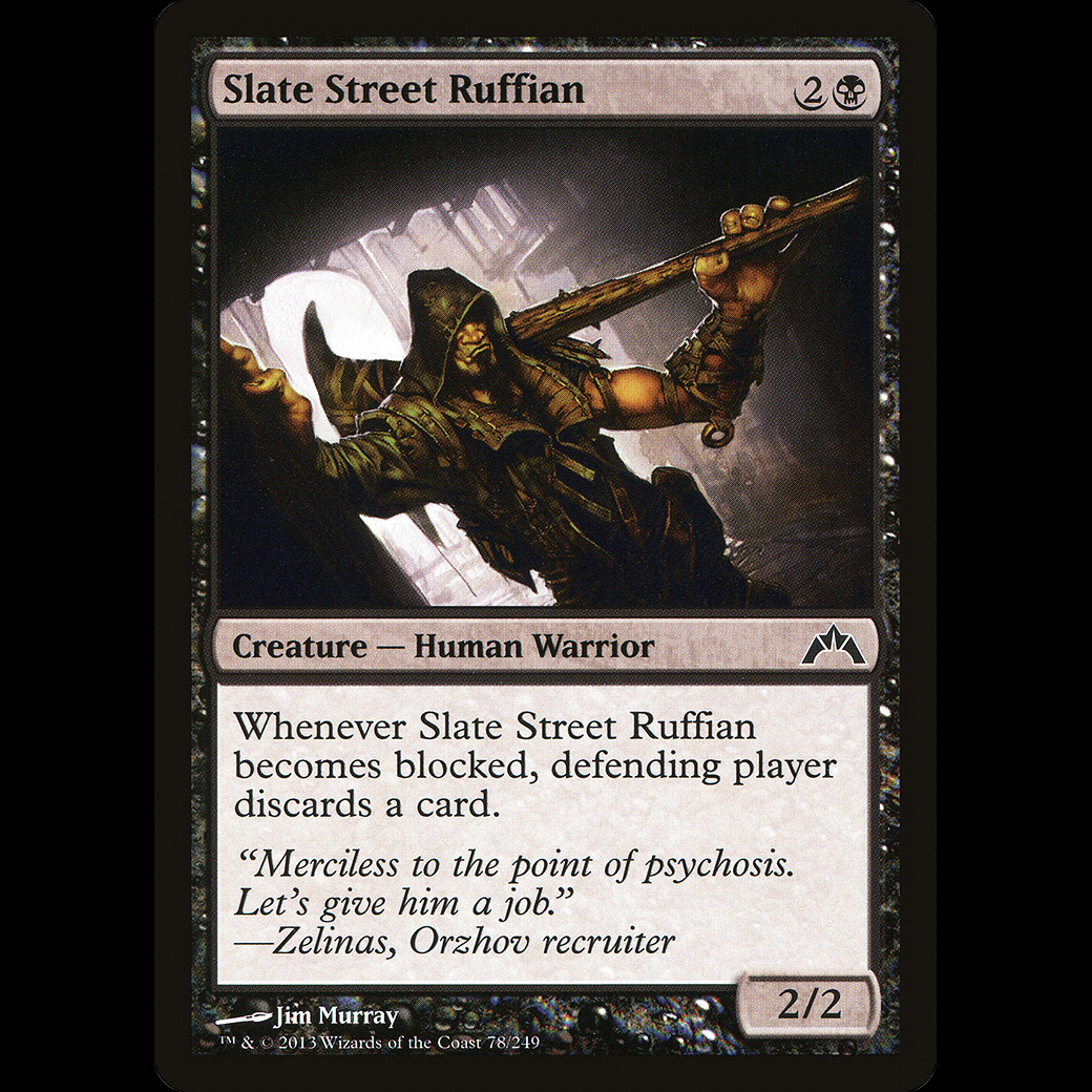 Whenever Slate Street Ruffian becomes blocked, defending player discards a card.