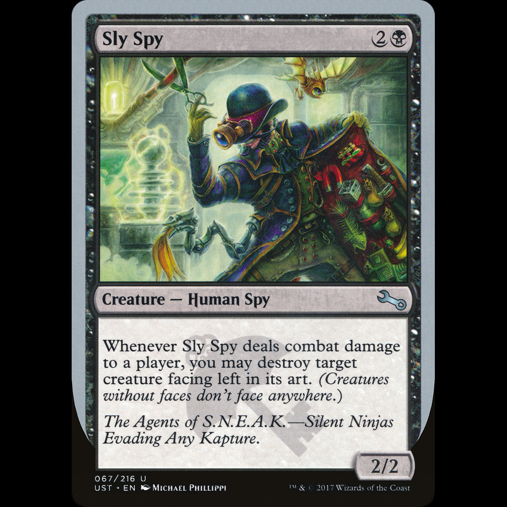 Whenever this creature deals combat damage to a player, you may destroy target creature facing left in its art. (Creatures without faces don't face anywhere.)