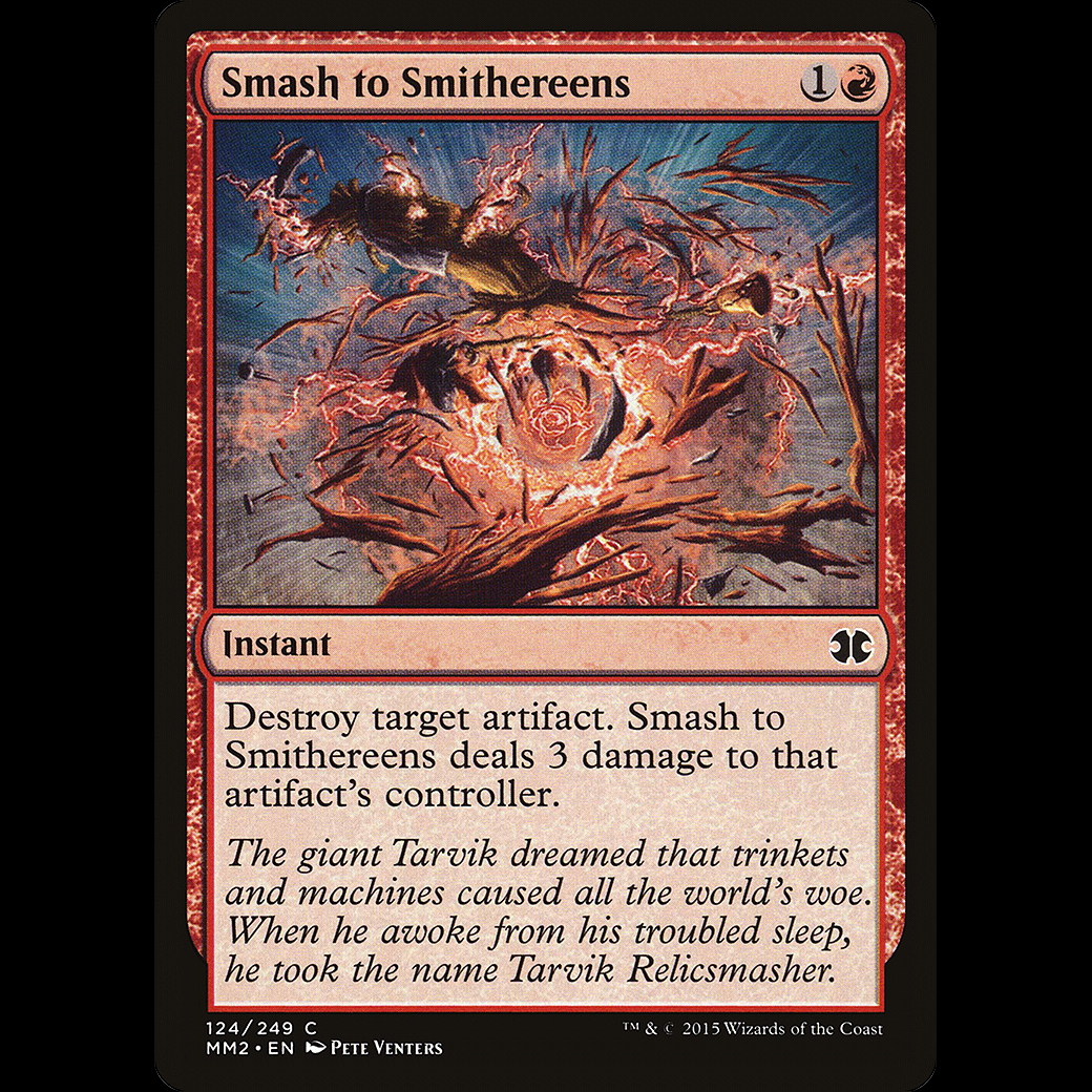 Destroy target artifact. Smash to Smithereens deals 3 damage to that artifact's controller.