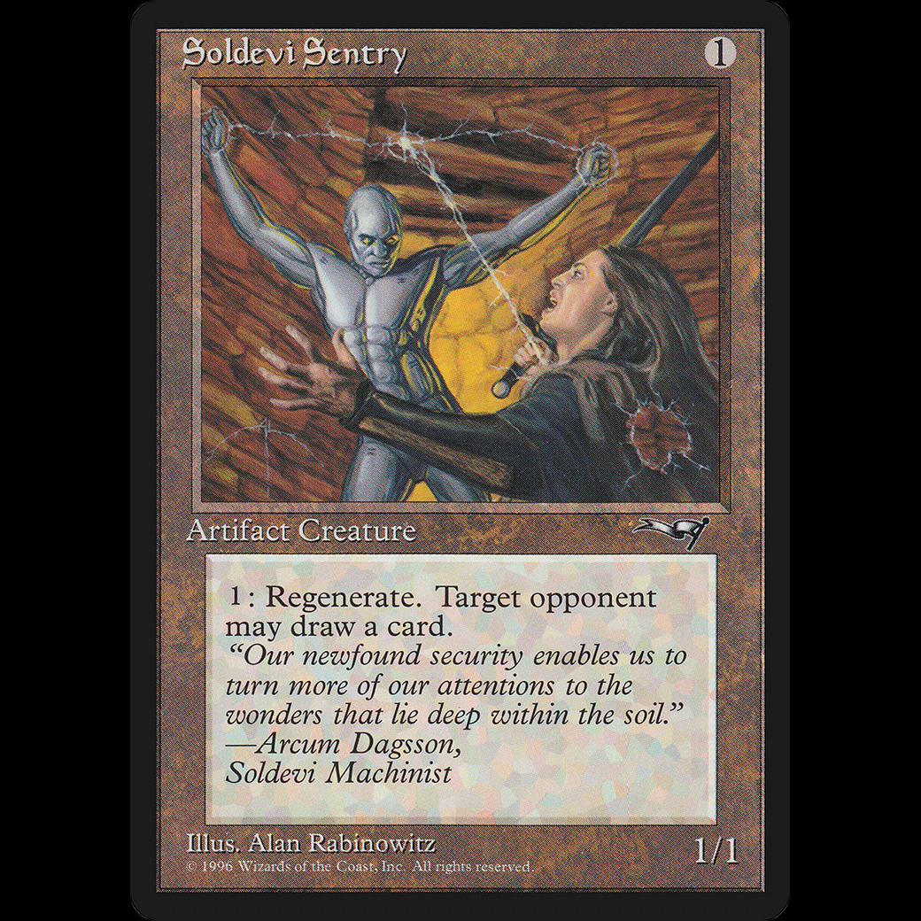 : Choose target opponent. Regenerate Soldevi Sentry. When it regenerates this way, that player may draw a card.