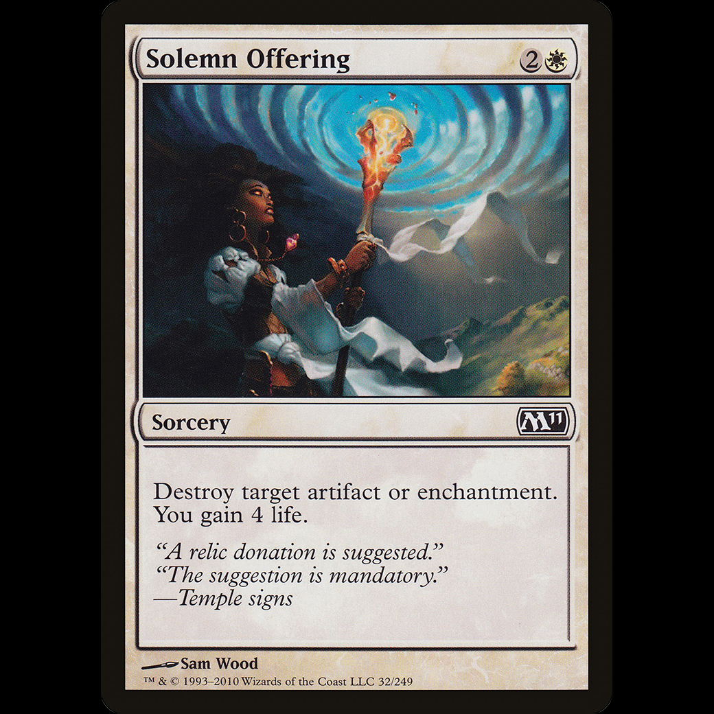 MTG Solemn Offering Magic 2011Destroy target artifact or enchantment. You gain 4 life.