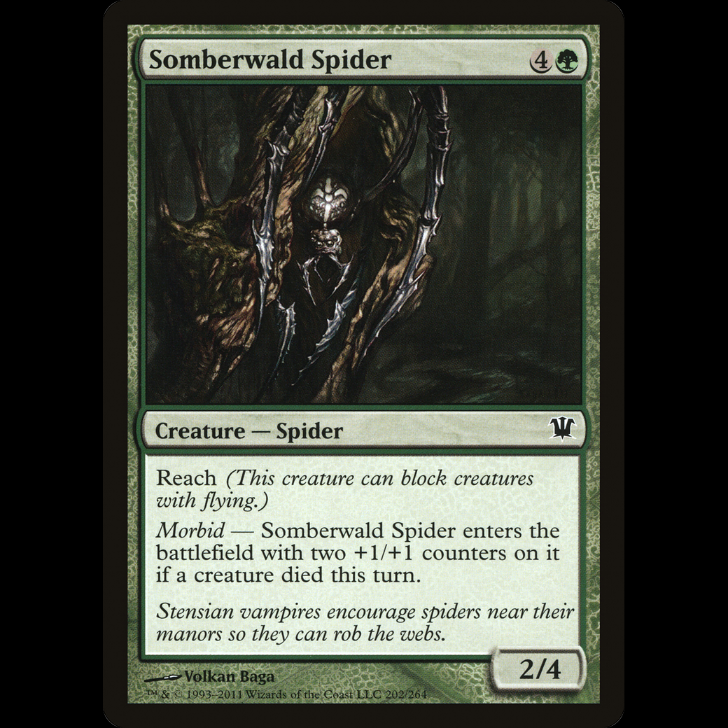 Morbid — Somberwald Spider enters the battlefield with two +1/+1 counters on it if a creature died this turn.