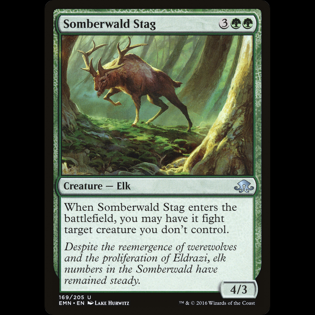 When Somberwald Stag enters the battlefield, you may have it fight target creature you don't control.