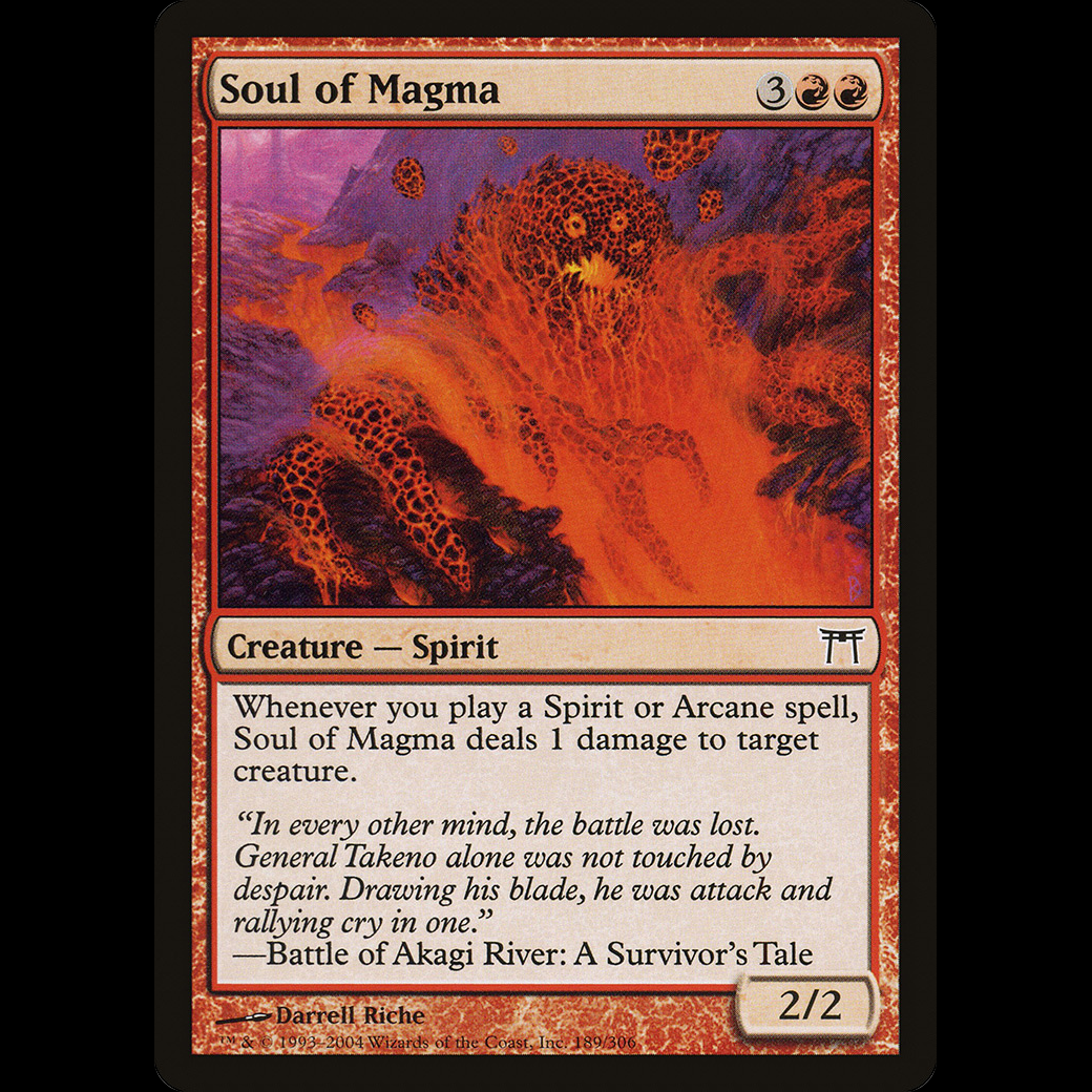 Whenever you cast a Spirit or Arcane spell, Soul of Magma deals 1 damage to target creature.