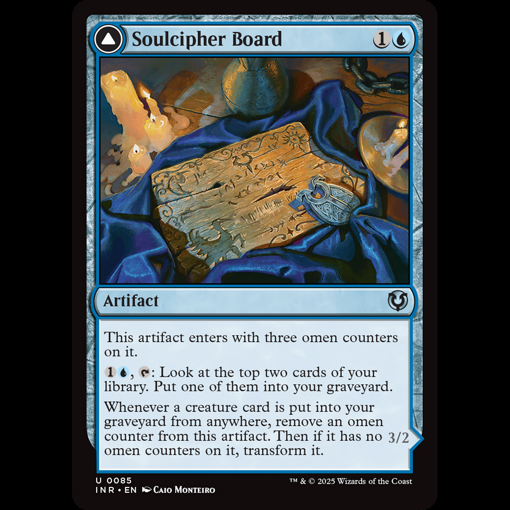 Whenever a creature card is put into your graveyard from anywhere, remove an omen counter from this artifact. Then if it has no omen counters on it, transform it.