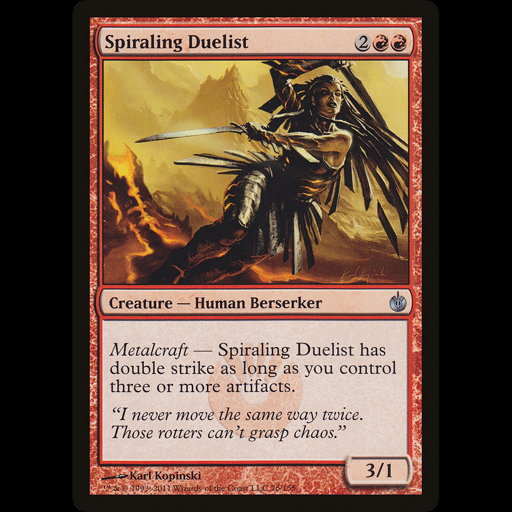 Metalcraft — Spiraling Duelist has double strike as long as you control three or more artifacts.