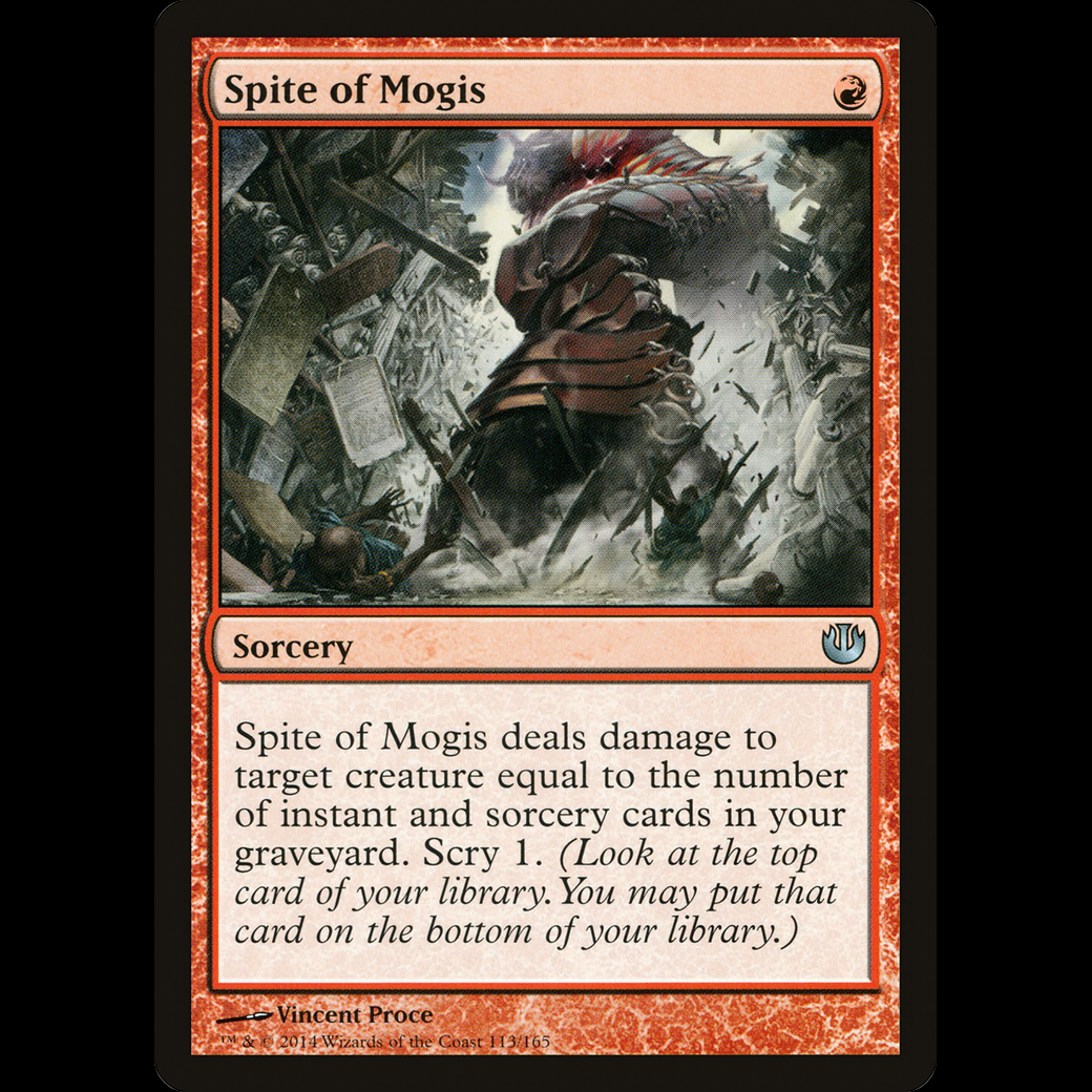 Spite of Mogis deals damage to target creature equal to the number of instant and sorcery cards in your graveyard. Scry 1. (Look at the top card of your library. You may put that card on the bottom of your library.)