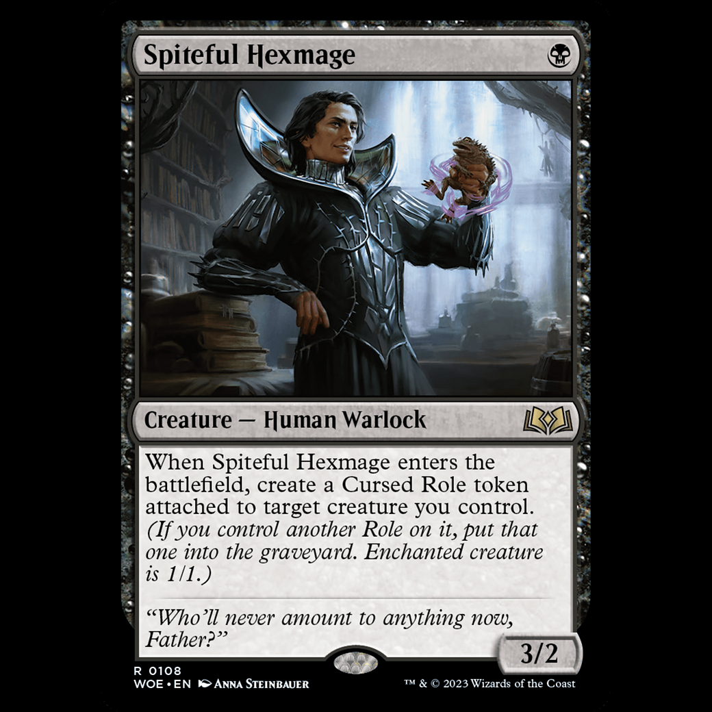 When Spiteful Hexmage enters the battlefield, create a Cursed Role token attached to target creature you control. (If you control another Role on it, put that one into the graveyard. Enchanted creature is 1/1.)