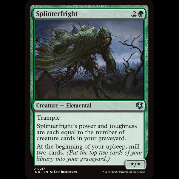 Trample Splinterfright's power and toughness are each equal to the number of creature cards in your graveyard. At the beginning of your upkeep, mill two cards.