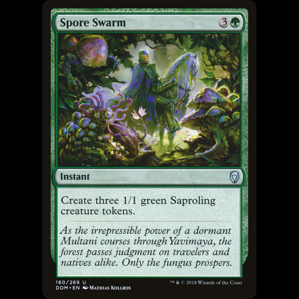 MTG Spore Swarm Dominaria dom#180Create three 1/1 green Saproling creature tokens.
