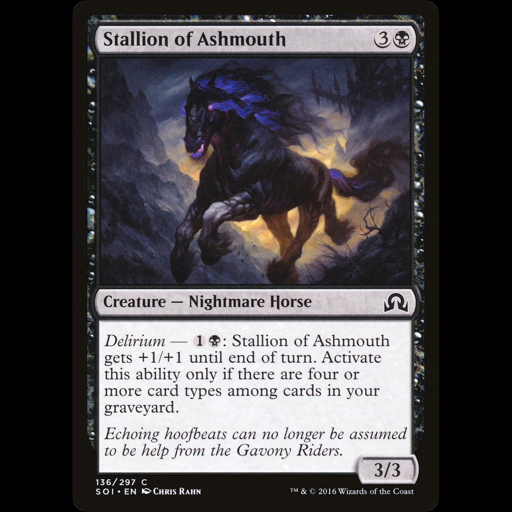 Delirium — : Stallion of Ashmouth gets +1/+1 until end of turn. Activate only if there are four or more card types among cards in your graveyard.