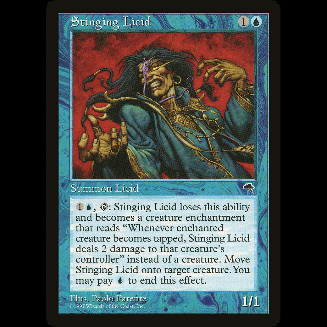 Whenever enchanted creature becomes tapped, Stinging Licid deals 2 damage to that creature's controller.