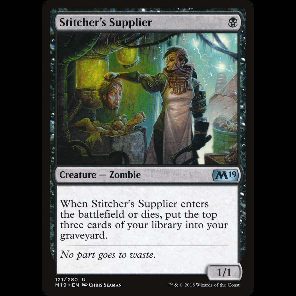 When Stitcher's Supplier enters the battlefield or dies, mill three cards.