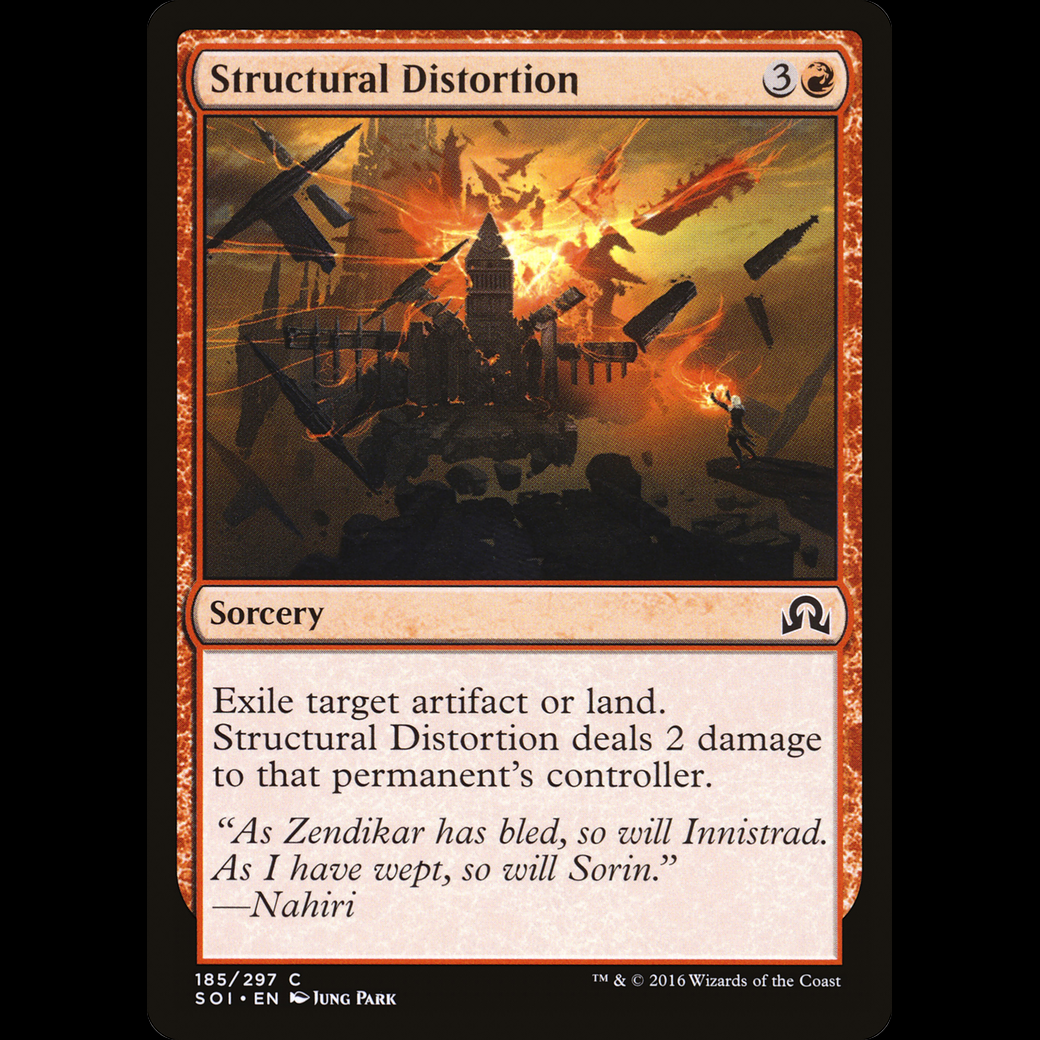 Exile target artifact or land. Structural Distortion deals 2 damage to that permanent's controller.