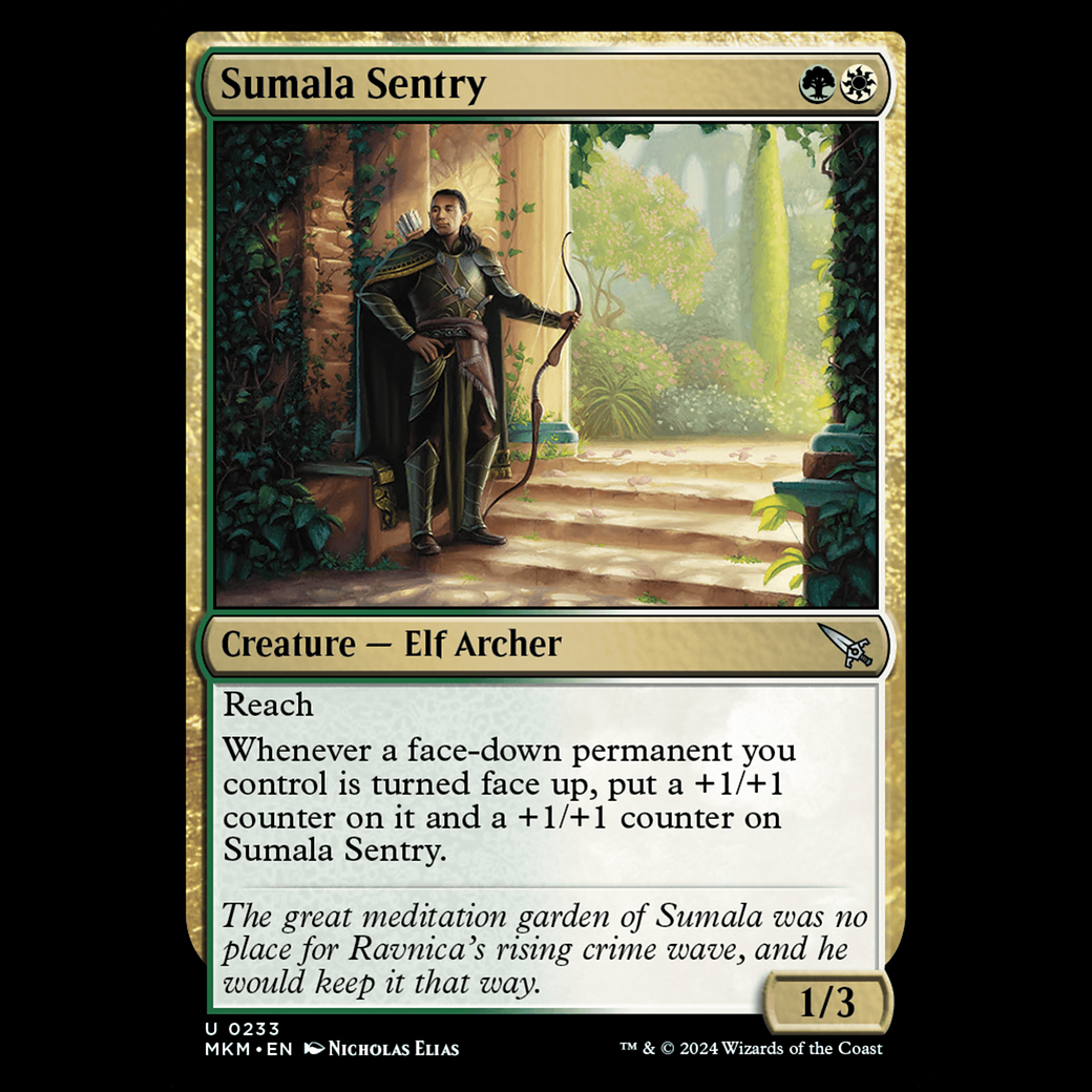 Whenever a face-down permanent you control is turned face up, put a +1/+1 counter on it and a +1/+1 counter on Sumala Sentry.