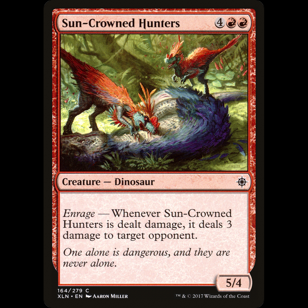 Enrage — Whenever Sun-Crowned Hunters is dealt damage, it deals 3 damage to target opponent or planeswalker.