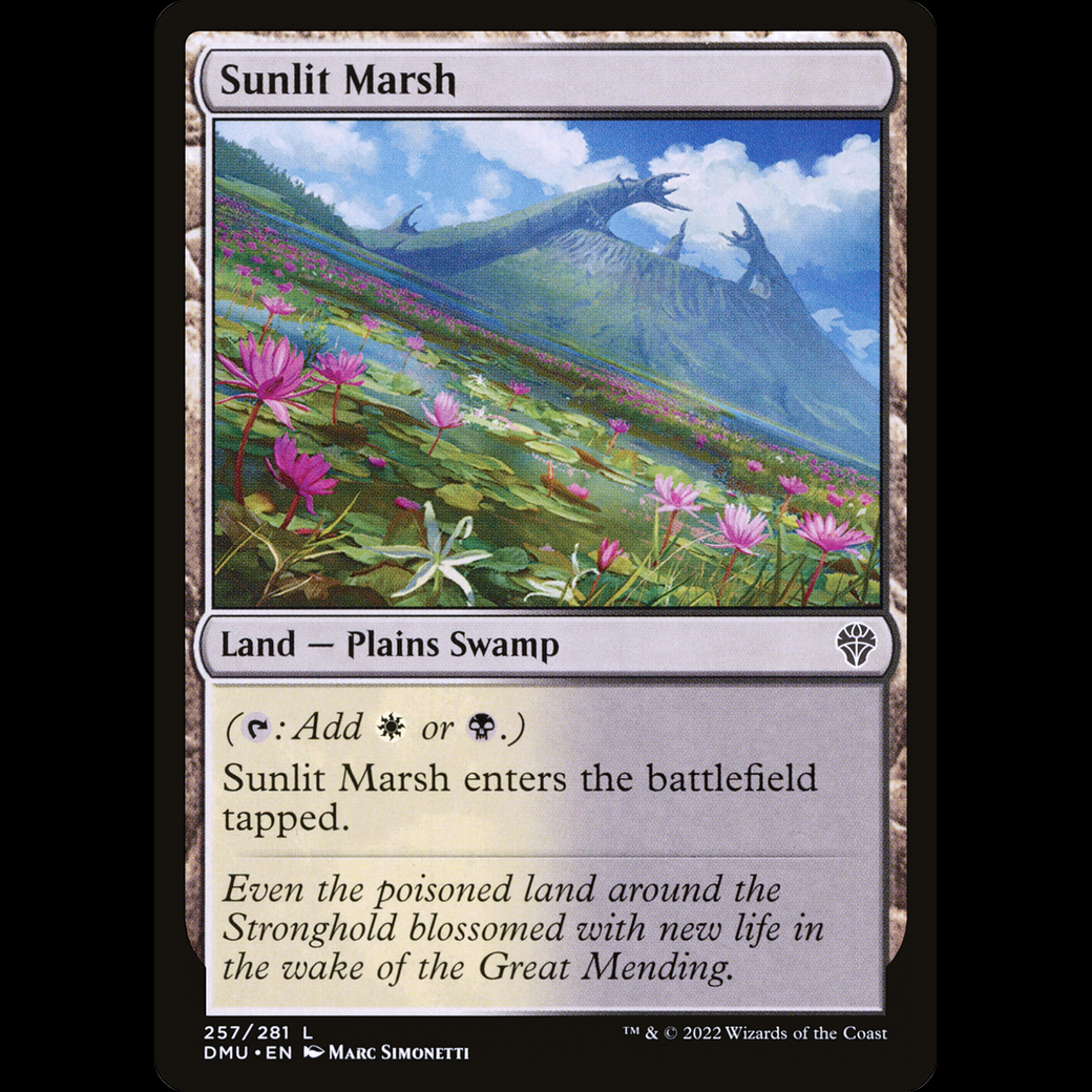 MTG Sunlit Marsh Dominaria United dmu#257(: Add or .) This land enters tapped.