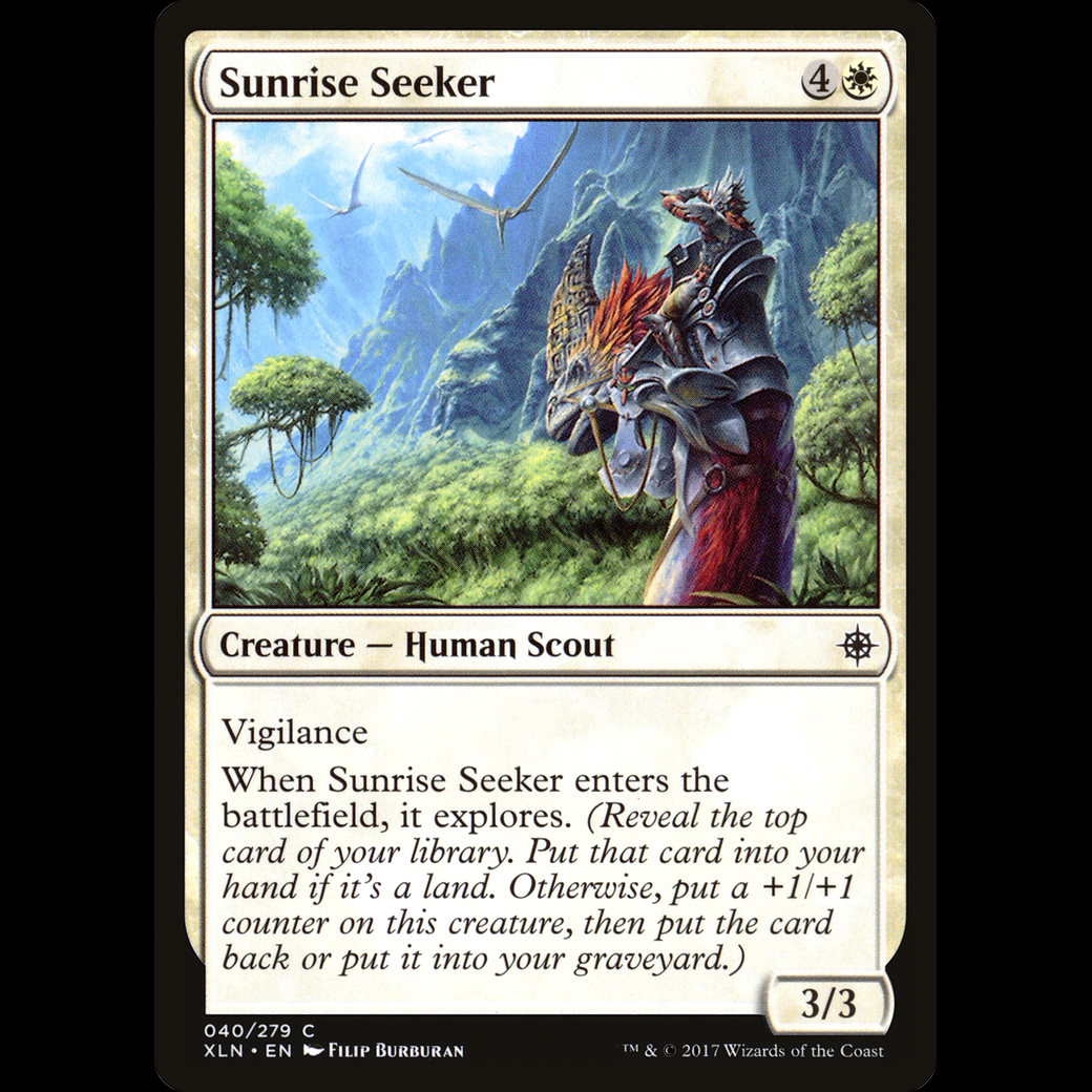 When Sunrise Seeker enters the battlefield, it explores. (Reveal the top card of your library. Put that card into your hand if it's a land. Otherwise, put a +1/+1 counter on this creature, then put the card back or put it into your graveyard.)