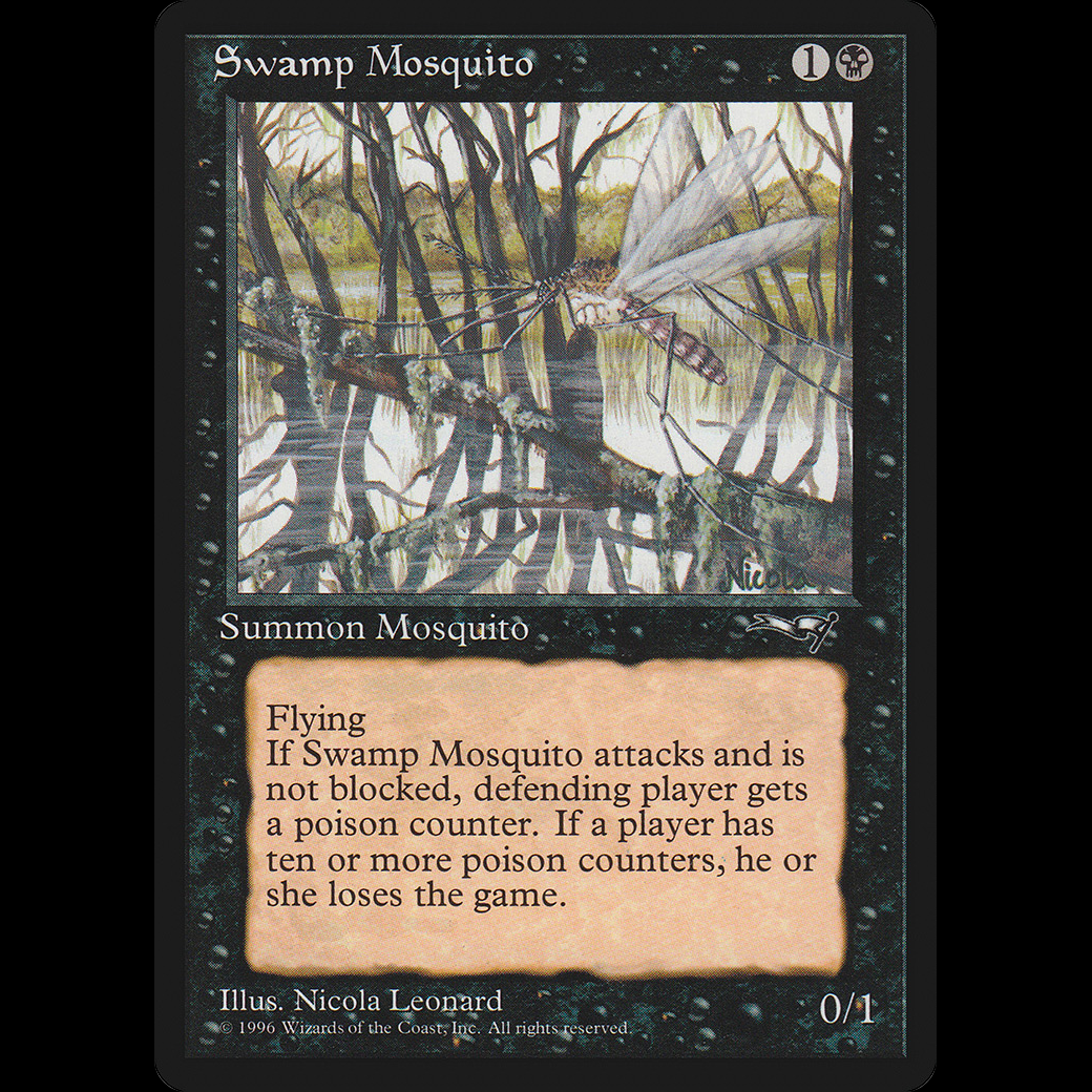 Whenever Swamp Mosquito attacks and isn't blocked, defending player gets a poison counter. (A player with ten or more poison counters loses the game.)