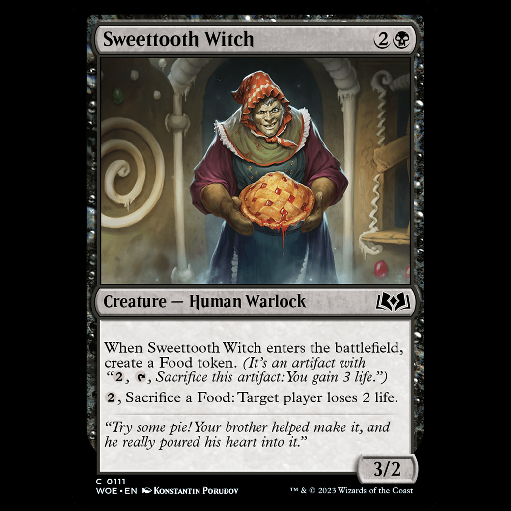 When Sweettooth Witch enters the battlefield, create a Food token. (It's an artifact with ", , Sacrifice this artifact: You gain 3 life.")