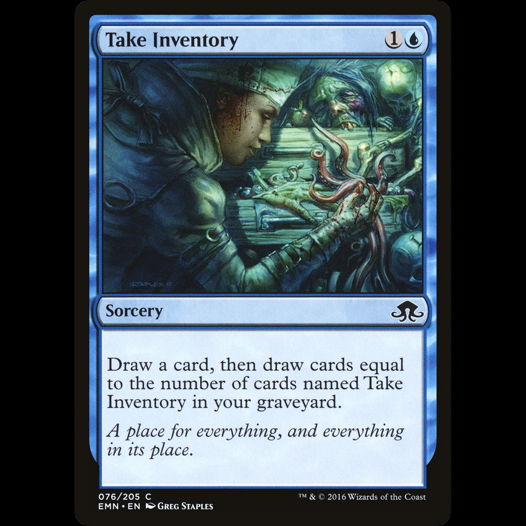 Draw a card, then draw cards equal to the number of cards named Take Inventory in your graveyard.