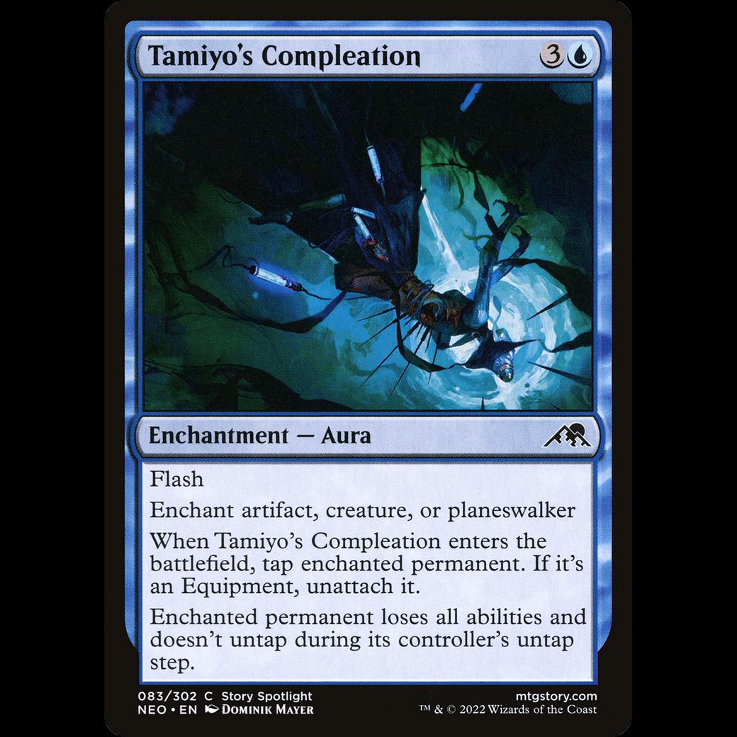 When Tamiyo's Compleation enters, tap enchanted permanent. If it's an Equipment, unattach it.